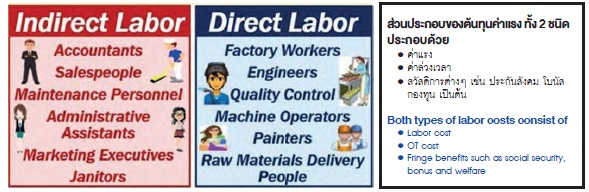 2.2 ค่าแรงงานทางอ้อม (Indirect Labor) หมายถึง ค่าแรงงานที่ไม่เกี่ยวข้องกับค่าแรงงานทางตรงที่ใช้ในการผลิตสินค้า เช่น เงินเดือนผู้ควบคุมโรงงาน เงินเดือนพนักงานทำความสะอาดเครื่องจักรและโรงงาน พนักงานตรวจสอบคุณภาพ ช่างซ่อมบำรุง ตลอดจนต้นทุนที่เกี่ยวข้องกับคนงาน เช่น ค่าภาษีที่ออกให้ลูกจ้างสวัสดิการต่างๆ เป็นต้น ซึ่งค่าแรงงานทางอ้อมเหล่านี้ถือเป็นส่วนหนึ่งของค่าใช้จ่ายการผลิต