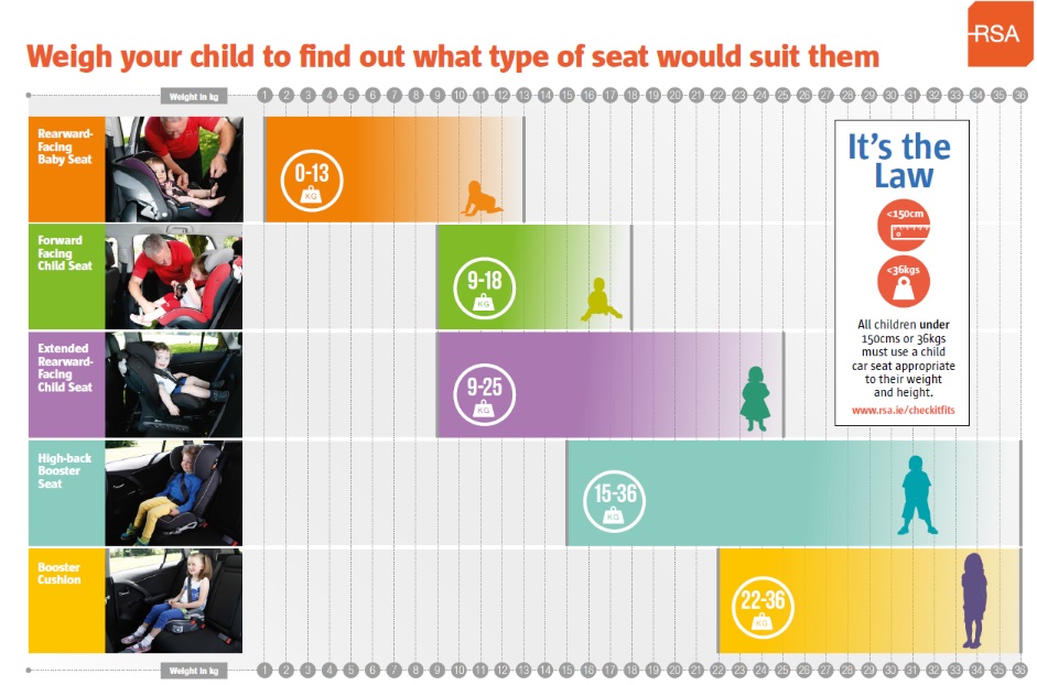 ที่นั่งเด็กชนิดนั่งหันไปทางหลังรถนี้เหมาะกับเด็กตั้งแต่แรกเกิดไปจนถึง 12 เดือน มีน้ำหนักไม่เกิน 9 กิโลกรัม และ ส่วนสูงไม่เกิน 75 ซม. ควรติดตั้งที่นั่งเด็กดังกล่าวในที่นั่งแถวหลัง เนื่องจากปลอดภัยกว่าแถวหน้าโดยเฉพาะในกรณีที่ “ที่นั่งแถวหน้า” มีการติดตั้งถุงลมนิรภัย (Airbag) เพราะแรงที่เกิดจากการระเบิดของถุงลมนิรภัยจะเพียงพอที่จะทำ ให้เด็กที่นั่งแถวหน้าได้รับอันตรายที่รุนแรงได้ และตามคำแนะนำของ NHTSA (National Highway Traffic Safety) ที่ได้แนะนำให้เด็กที่อายุต่ำกว่า12 ปี ควรนั่งที่นั่งเด็กที่ “ที่นั่งแถวหลัง” ด้วยเช่นกัน