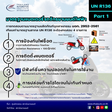 - Part 1 หมายถึง การทดสอบมาตรฐานความปลอดภัยจากรถจักรยานยนต์ไฟฟ้า “ทั้งคัน”