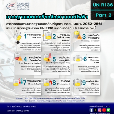 การทดสอบแบตเตอรี่ตามมาตรฐาน มอก. 2952-2561 เทียบเท่า UNECE Regulation 136 (R136) มีจุดประสงค์เพื่อสร้างความมั่นใจในความสมบูรณ์และการทำงานที่ปลอดภัยของระบบแบตเตอรี่ ที่ใช้ในรถขนาดเล็ก เช่น จักรยานยนต์ไฟฟ้า รถสามล้อ ภายใต้สภาพการใช้งานเสมือนจริง เพื่อมอบความปลอดภัยให้ผู้ขับขี่ยานพาหนะและผู้โดยสาร” ประกอบด้วยการทดสอบ 9 รายการ ได้แก่