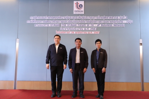 นางสาวณัฏฐิญา เนตยสุภา อธิบดีกรมส่งเสริมอุตสาหกรรม มอบหมายให้ นายวัชรุน จุ้ยจำลอง รองอธิบดีกรมส่งเสริมอุตสาหกรรม เป็นประธานในพิธีเปิดกิจกรรม “การฝึกอบรมถ่ายทอดองค์ความรู้และยกระดับผู้ประกอบการไทยสู่ตลาดสากล” รุ่นที่ 2 ภายใต้โครงการพัฒนาศักยภาพและเชื่อมโยงเครือข่ายเพื่อโอกาสการขยายธุรกิจไทย – ญี่ปุ่น ตามแนวทาง OTAGAI (The OTAGAI Forum of TH – JP Business Network) ประจำปีงบประมาณ พ.ศ. 2567 โดยมี ดร.เกรียงศักดิ์ วงศ์พร้อมรัตน์ ผู้อำนวยการสถาบันยานยนต์ คณะผู้บริหาร และเจ้าหน้าที่ดีพร้อม (DIPROM) เข้าร่วม ณ ห้องศรีนครินทร์ 1 ชั้น 1 โรงแรมดุสิต ปริ้นเซส ศรีนครินทร์ กรุงเทพฯ